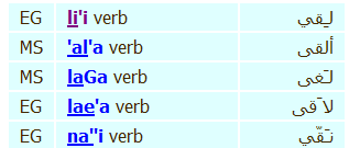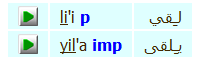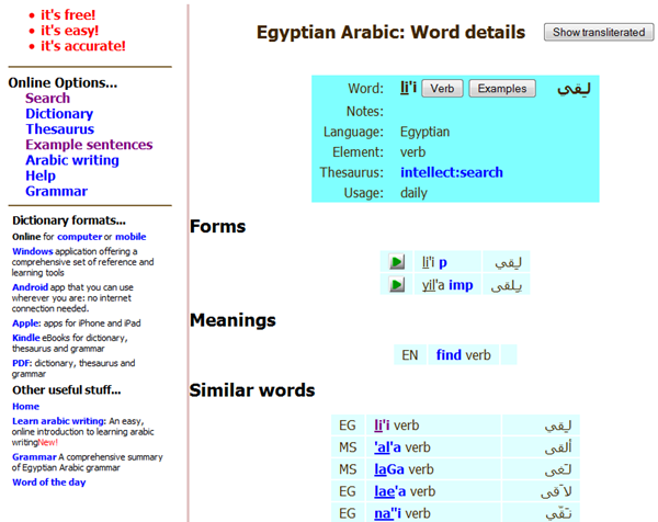 Arabic words are displayed both in arabic writing and in european letters. There are two options for displaying words in european letters- transliterated and pronounced. You can click on and to switch between the two. For more information about the differences between the two systems and an introduction to arabic writing, see Arabic Writing.